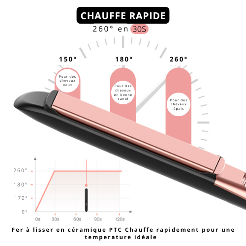 Le lisseur chauffe en quelques secondes seulement. Il atteint la température souhaitée rapidement grâce à son système de chauffage rapide, pour un gain de temps au quotidien.